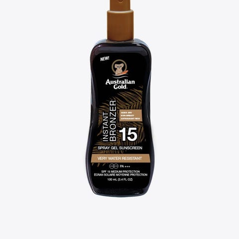 Australian Gold Instant Bronzer solkrem spraygel med solfaktor 15 og 30. Spraygel-solkremene er vannresistente og inneholder bronzer. SPF 15-varianten er merket «Very Water Resistant», mens SPF 30-varianten er merket «Tan and Protect». Begge flaskene inneholder 237 ml (8 fl. oz.) og er egnet til bruk på kropp ved soleksponering.