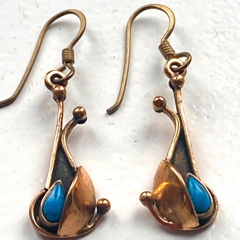 Eldre øredobber i tradisjonell zuni-stil, en stamme av USA's urbefolkning (indianere) som holder til i New Mexico. Om det faktisk er laget av dem kan jeg jo ikke si sikkert, men stilen stemmer.