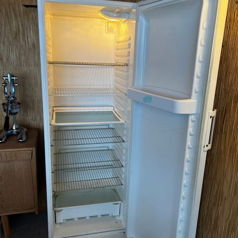 Kjøleskapet har én dør og innvendig belysning. Inne i skapet er det flere justerbare glasshyller, grønnsaksskuffer nederst og dørhyller i full høyde for oppbevaring av flasker og mindre varer. Egnet som hovedkjøleskap på kjøkken eller som ekstra kjøleskap på hytte, bod eller vaskerom.