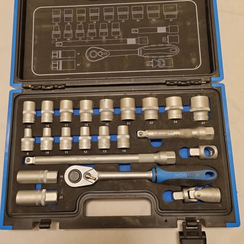 Pipe-/bitssett med 24 deler. Topptrekker på skralle med 7° per klikk. Settet inkluderer 2 stk forlengere med woble funksjon, sekskant pipe 4, 5, 5,5, 6, 7, 8, 9, 10, 11, 12, 13 mm - 9 stk bits Torx 20, 40, HEX 4, 5, 6, Pozidriv 2, Phillips 2, Adapter 1/4" - 1/4", Forlenger 100 mm, toppadapter til skruemaskine, skrallenøkkel med 48 tenner og Quick-lock.