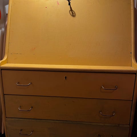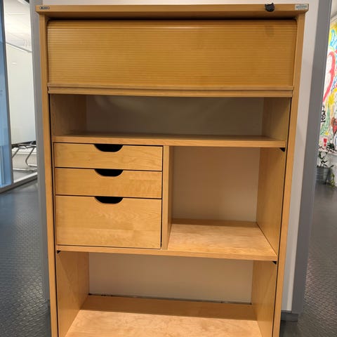Fin skuffeseksjon i metall og hjul under. Har passet fint under et skrivebord hos oss og rommer masse lure saker og duppedingser - eller ark og tegnesaker 😊
