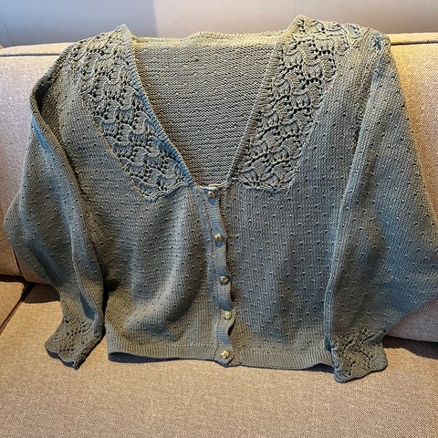 Genser i strikk med hullmønser i duse fine farger. Snor foran som kan reguleres lengde