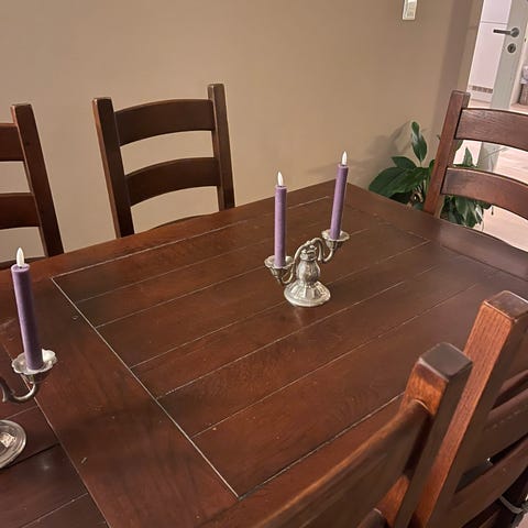 6 stoler som er gode å sitte på. Bordet kan gjøres større og 2 ileggsplater følger med