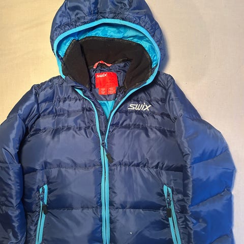 Swix dunjakke for barn i størrelse 128-134 (ca 6-8 år), unisex. Jakken er svart og fylt med dun, med ytterstoff i nylon. Varm og god. Den har avtagbar hette, høy krage med snøring og glidelås i front. På baksiden er det påsatte refleksmerker. Merker fra tidligere refleks klistremerker på front og en arm (se bilder). Passer til hverdagsbruk og uteaktiviteter i kaldt vær.