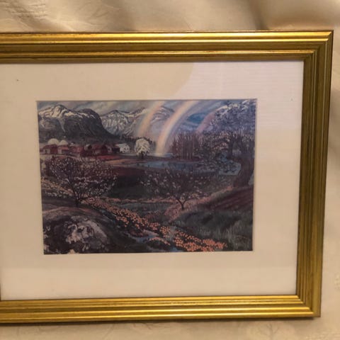 90cm x 80cm Nikolai Astrup kunsttrykk med landskapsmotiv som viser en kvinne i hage omgitt av trær, planter og fjell i bakgrunnen. Bildet er montert med passepartout og innrammet i en gullfarget ramme. Motiv og farger går i hovedsak i blå, grønne og jordnære toner. Egnet som veggdekor i stue, gang eller andre oppholdsrom.