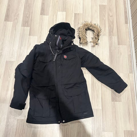 Fjällräven vinterjakke for dame i størrelse M. Jakken er svart og laget i polyester. Modellen har hette, glidelås foran med knappestolpe og flere praktiske lommer. Egner seg som ytterjakke i den kalde årstiden, da den er god og varm varm.