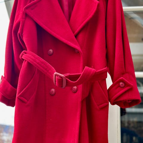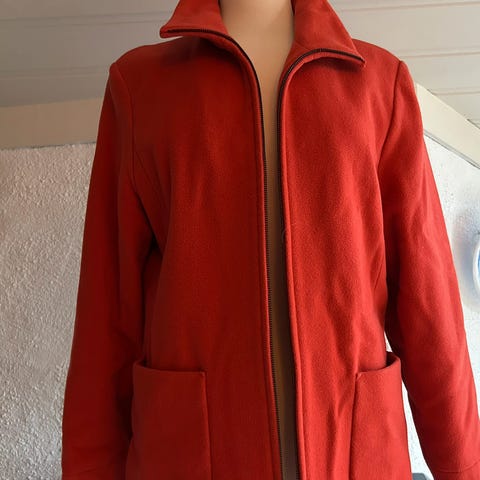 Flott jakke i 80 % ull i varm rød farge med rødt for og svarte knappar. Jakka har fold i ryggen og lommar i saumane foran. Ein liten innerlomme med knapp. Jakka er ubrukt pga feil størrelse.