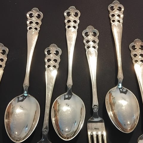 Norønna sølvplett gaffler og skjeer. Kakespader i mønster Dobbel Rokokko selges.