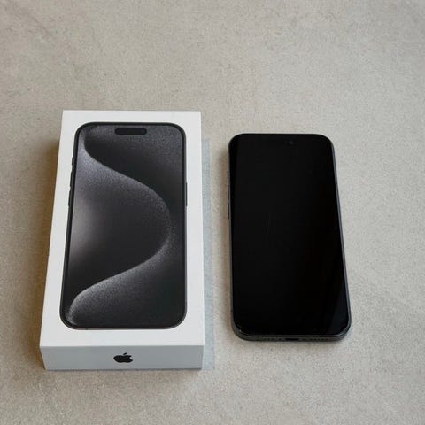 Apple iPhone 15 Pro smarttelefon med 256 GB lagringskapasitet. Modellen har stor berøringsskjerm på forsiden og trippelkamera med blits på baksiden. Farge hvit med metallramme.