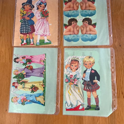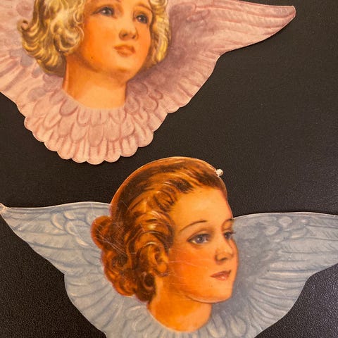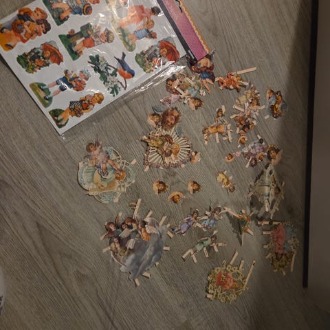 Samling med glansbilder i papir med englemotiv i ulike størrelser og fasonger. Motivene inkluderer engler, englebarn og hoder med vinger i flere farger. Figurene er trykt på fremsiden og hvite på baksiden. Egnet til hobbyprosjekter, kortlaging, scrapbooking og dekorasjon.