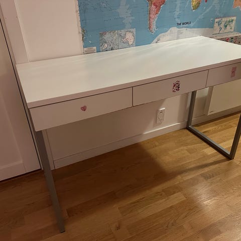 IKEA sminkebord med speil i svart utførelse. Bordet har en rektangulær bordplate og integrert, ovalt speil festet til bakre del av bordet. Under bordplaten er det en skuff for oppbevaring av sminke og tilbehør. Overflaten på bordplaten viser noen riper, som vist på bildene. Egner seg som sminkebord eller lite arbeidsbord i soverom eller garderobeområde.