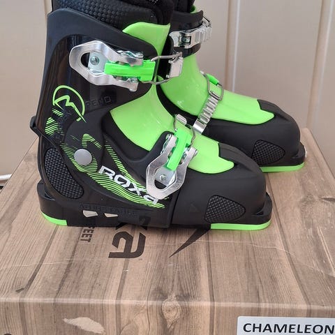 Roxa alpinstøvler i grønn og svart farge. Støvlene har flere justerbare spenner i metall foran for å gi god tilpasning rundt fot og legg. Ytterskallet er i plast med forsterkninger ved tå og hæl. Innvendig er det polstret innerstøvel for komfort og støtte. Egnet til bruk i alpinanlegg med kompatible alpinbindinger. Størrelse og mål er ikke oppgitt og bør kontrolleres før kjøp.