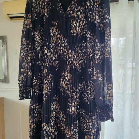 Fin kjole fra Nümph, sort med hvite blader. Knytes bak rundt livet.