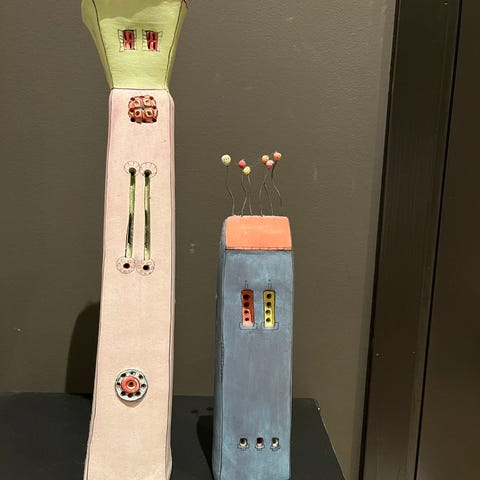 Keramikk beger på stett i håndlaget utførelse. Begerne har høy, slank stettfot og koppformet topp. Glasuren er hovedsakelig hvit med innslag av grønn og mørkere dekor som gir et organisk uttrykk. Egner seg som dekorative objekter, for eksempel på hylle, bord eller i vitrineskap. Men kan også brukes til å drikke av.