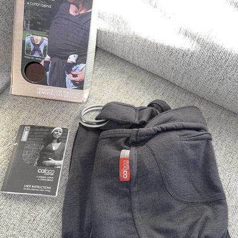 BabyBjörn bæresele med stripete innside og mørke stropper. Bæreselen har justerbare stropper og spenner for tilpasning til bærer og barn. Illustrasjoner på innsiden viser ulike bærestillinger og bruk. Egnet til å bære spedbarn og småbarn innenfor angitt lengde- og vektområde på etiketten.