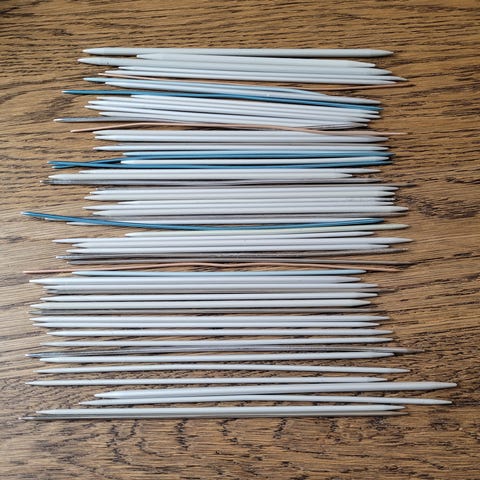 Diverse lange strikkepinner. Beholder medfølger.