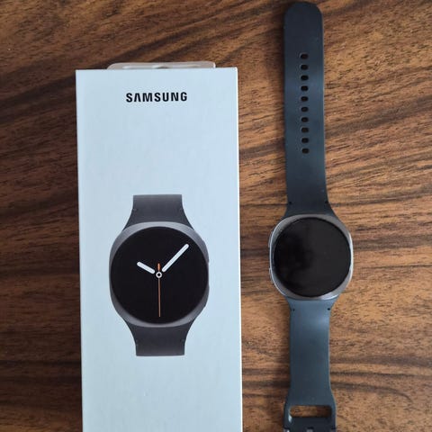 Samsung Galaxy Watch5 (40mm) smartklokke i svart. Modellen har rund berøringsskjerm og leveres med svart rem. Klokken viser blant annet tid, dato og batteriprosent på skjermen. På baksiden av klokken finnes sensorer for måling mot håndleddet. Modellen identifiseres som SM-R910 i menyen på klokken. Egnet som smartklokke til hverdagsbruk, trening og varslinger fra mobil, avhengig av tilkobling og kompatibel telefon.