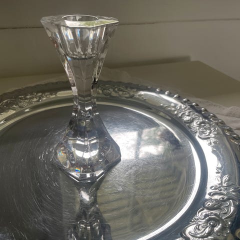 Enkel og pen lysestake i krystall. Vakker på et fat og gir pent skinn.