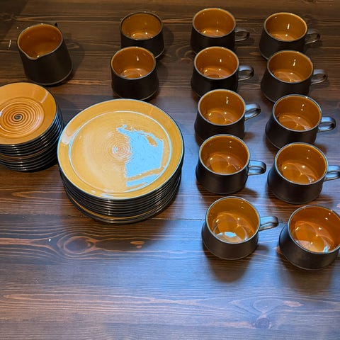 AB Keramikk kaffeservise i keramikk i gult med svart kant og dekor i grå og orange/lys rød. AB keramikk er av Danske Anette Bjerregård. Ingen skader eller hakk. Pakkes godt ved sending. Selges samlet kr 350