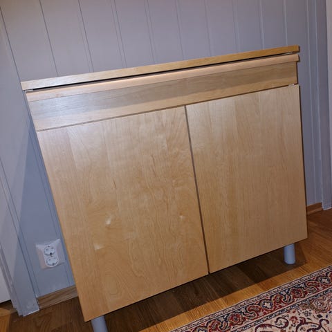 Selger det billig da det har litt ymse kosmetisk feil. Følger med lys i det. Må hentes og bæres ut av kjøper. Er skåret ut hull til stikk kontakt i veggen inni/bak skapet.