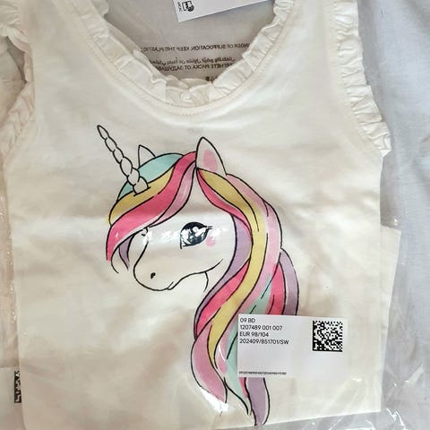Selger en kjempesøt hvit singlet med fargerikt regnbue-print og glitrende hjerter fra H&M i størrelse 98/104 (2-4 år).