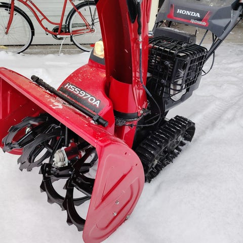 Honda HSS970A snøfreser med beltedrift i rød. Maskinen har belter for godt feste på glatt underlag og er egnet for rydding av snø på gårdsplasser, innkjørsler og lignende områder. Utblåsningskanalen er justerbar for å styre snøretningen. Passer til privat bruk der det er behov for effektiv snørydding på ulike underlag.