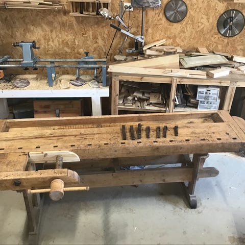 Høvelbenk fler med noen stemjern og planker