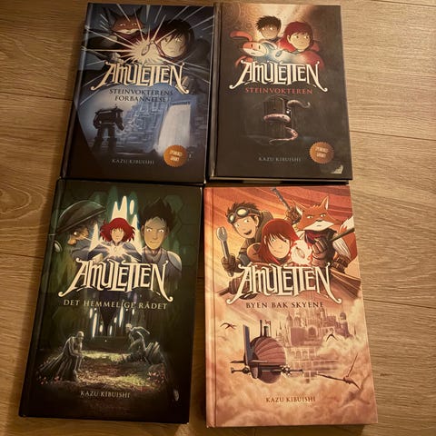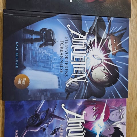 Amuletten bokserie tegneserier i norsk utgave. Serien består av flere bøker i samme format, med fargerike omslag og rygg. Bøkene er innbundet og utformet som grafiske romaner/tegneserier. Egner seg for lesere som liker fantasy og illustrerte fortellinger. Serien kan plasseres samlet i bokhylle, og hver bok følger nummerering på ryggen for enkel oversikt.