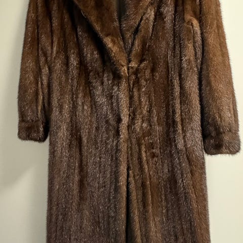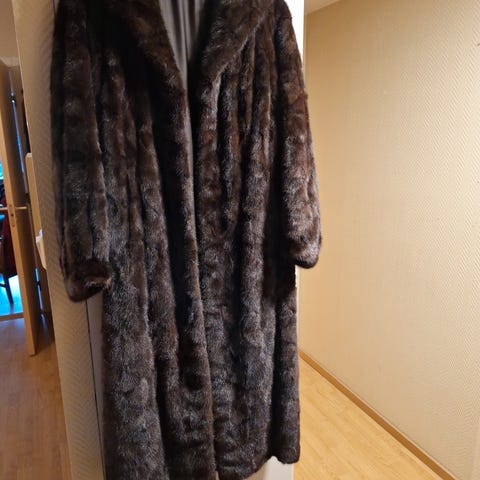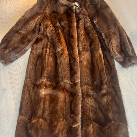 Ubetydelig brukt mørk brun mink hjerte pels jakke. 50 cm bryst og 70 cm lengde fra skuldre. Jakken er dobbelt spent.