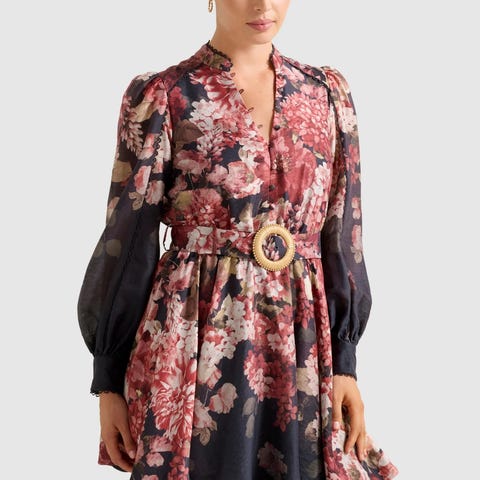Ellos sommerkjole for dame i størrelse 42/44. Kjolen er laget i polyester og har et flerfarget blomstermønster. Modellen har lange, lett transparente ermer med strikk og volangkant ved håndleddene. Halsen er rund med liten ståkrage og knyting foran. Livet har strikk som gir en lett innsvinget fasong. Skjørtet er kort med flere volanger som gir et luftig uttrykk. Passer til bruk på varme dager, til hverdags eller enkle anledninger. Ubrukt. Ny pris 549kr