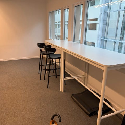 Skrivebord i hjørneløsning med treplate og grått metallunderstell. Bordplaten har utsparing i front og er godt brukt med tydelige riper og slitasje. Understellet består av T-formede ben i metall. Egner seg som arbeidsbord eller PC-pult på kontor, lager eller verksted der utseende ikke er avgjørende. Bordet monteres mot vegg og gir god plass til skjerm, tastatur og annet utstyr.