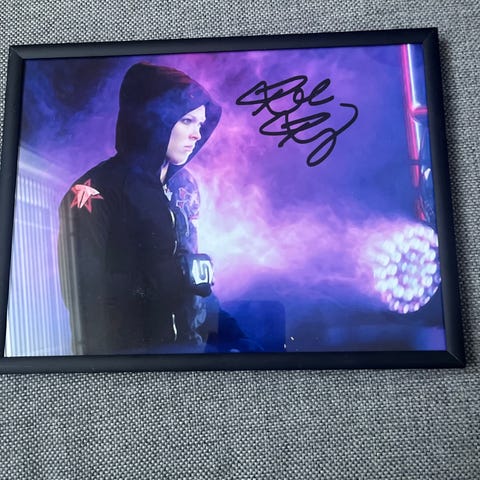 Innrammet signert bilde av Jon Jones. Utvendige mål: bredde:19cm. Høyde:24cm.