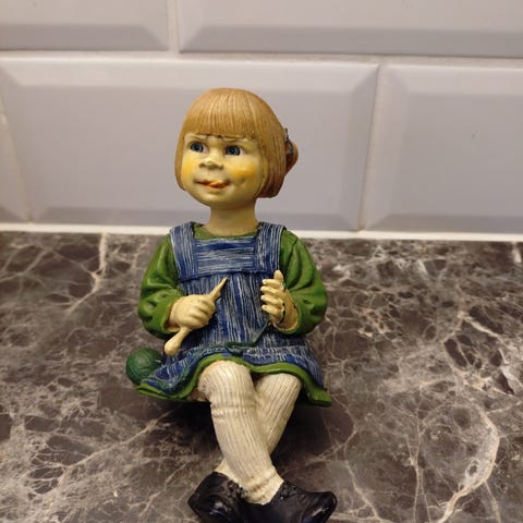 Hun er ca 14cm høy. Tror hun har en pepperkake i hånda og at denne har en skade. Ellers fin.