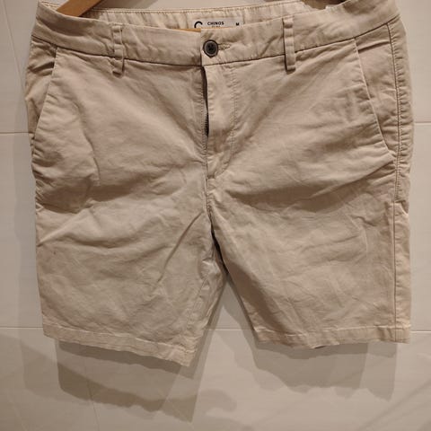 Herre shorts i størrelse M i hvit bomull. Shortsen har strikk og snøring i livet, samt sidelommer og en baklomme. Passer til hverdagsbruk og fritidsaktiviteter.