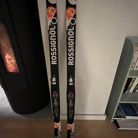 Rossignol P-Skin langrennski med integrert fell i sålen. Skiene har svart overflate med grafiske detaljer og er utstyrt med Rottefella-bindinger for klassisk langrenn. P-Skin-fellen gir feste uten behov for tradisjonell smøring. Skiene er kun brukt ett par ganger.