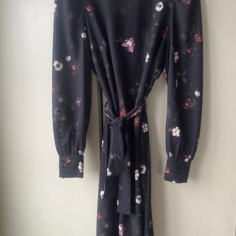Floyd sommerkjole i størrelse L. Lang kjole i hvit bunnfarge med blomstrete mønster. Produsert i viskose. Kjolen har lange ermer med strikk nederst, knapper i front og markert midje med rynkedetaljer. Passer som sommerkjole til hverdagsbruk eller enklere anledninger.