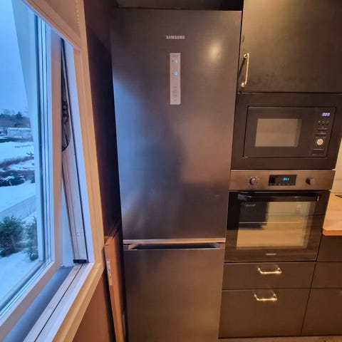 230l kjøl/114l frys. Pent 185,3 cm frittstående Samsung kombiskap i stål.
