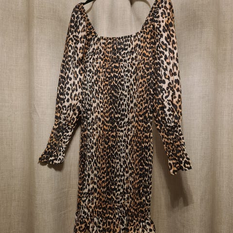 Ganni festkjole for dame i størrelse 40. Kjolen er laget i polyester og har et flerfarget mønster med oransje blomster på svart bunn. Modellen har lange ermer med lett volangkant, høy hals med rysjedetaljer og markert midje. Stoffet er lett og delvis transparent, egnet til bruk ved festlige anledninger og andre formelle eller semi-formelle sammenhenger.