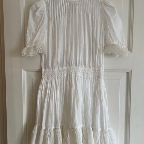 Cras festkjole i størrelse 38. Kjolen er i nydelig blåfarge med vevd mønster i stoffet. Modellen har omslagseffekt foran, lange ermer og markert skulder. Skjørtet er kort med draperinger og knappedetaljer i siden. Glatt, vevd materiale. Glidelås i siden.