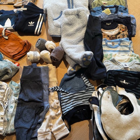 Klespakke med 4 bodyer, en pen bukse, 2 pyjamaser og 4 bukser selges samlet :)