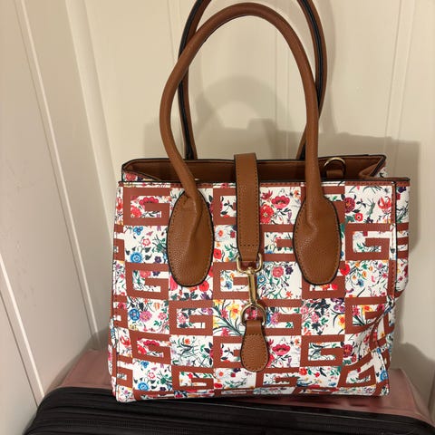 Vesken er i brun kunstlær med preget struktur. Den har to brede skulderremmer og lukkes med glidelås på toppen. Innvendig er det hovedrom med mindre lommer for oppbevaring av småting. Egner seg til hverdagsbruk, jobb eller studier, med plass til det mest nødvendige som lommebok, mobil, nøkler og små tilbehør.