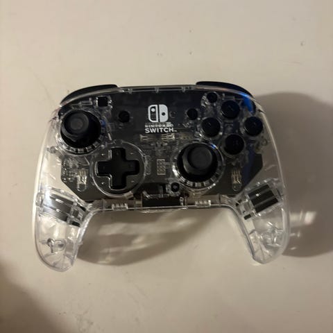 Nintendo Switch Pro-kontroller med et gjennomsiktig rødt design. Trådløs kontroller kompatibel med Nintendo Switch. Designet for komfortabel spilling med standardknapper og et ergonomisk design.