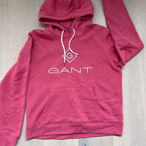 Gant hettegenser for dame i størrelse L. Genseren er rosa og laget i bomull. Modellen har hette med snøring og stor kengurulomme foran. På brystet er det trykket Gant-logo og tekst. Passer til hverdagsbruk og avslappede anledninger.