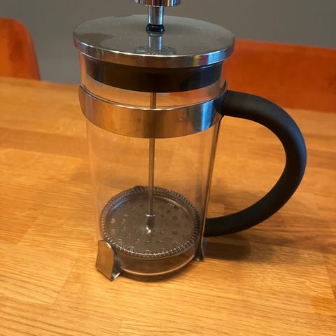 Sjelden press kanne i rustfritt stål. Den har doble vegger og holder godt på varmen. Høyde 17,5 cm. Kan hentes ved busstopp Langerudhjemmet (buss nr 70). Kan levere i Oslo sentrum eller sende med Posten/PostNord.