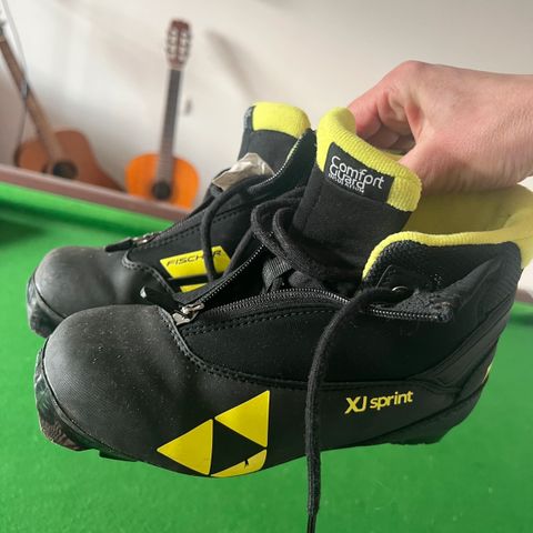 Fischer XJ Sprint langrennsstøvler i størrelse EU 34. Støvlene er i fargene svart og gul, med Comfort Guard-merking. Overdelen er i syntetisk materiale med tekstilfôr på innsiden. Sålen er tilpasset klassisk langrenn og passer til barn/unge. Egnet for bruk med kompatibelt bindingssystem til klassisk langrenn.