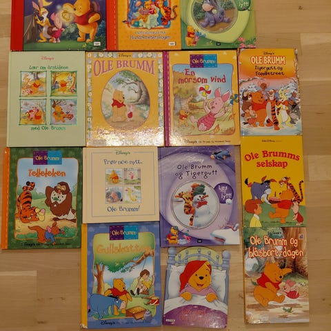 Disney Ole Brumm barnebøker samling. Pakken inneholder flere ulike Ole Brumm-bøker, blant annet kokebok, julefortellinger, bildebøker og fortellinger fra Hundremeterskogen. Bøkene er illustrerte og egner seg som høytlesningsbøker og bildebøker for barn. Flere av titlene har stive permer, og utvalget består av både lengre fortellinger og kortere historier om Ole Brumm og vennene hans.