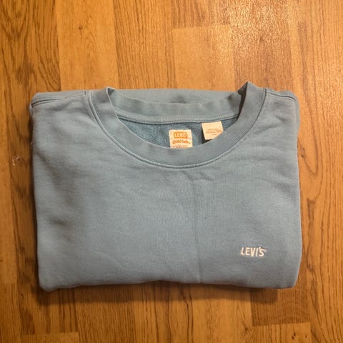 Levi's genser for herre i størrelse L. Genseren er beige og laget av bomull. Klassisk rund hals og ribbestrikkede mansjetter og linning. Diskré Levi's-logo på brystet. Passer til hverdagsbruk og kan kombineres med både jeans og chinos.