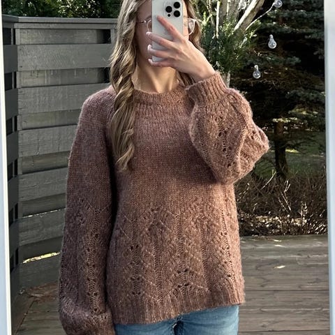 b.young Bybjojo genser for dame i størrelse XL. Genseren er brun og strikket i bomull. Den har rund hals, ribbestrikket struktur og mønsterstrikk langs sidene foran. Modellen har rett passform og normal lengde, med lange ermer og ribbekanter.