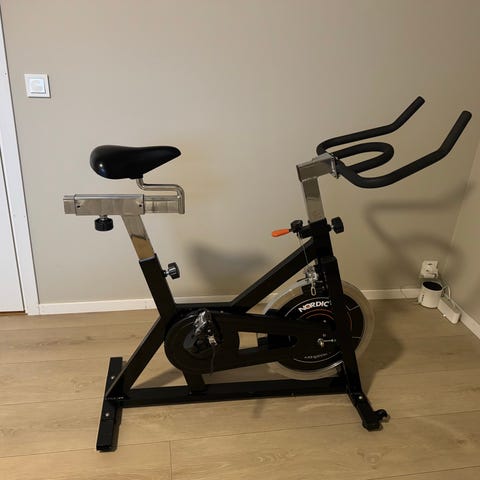 Spinningsykkel i svart og turkis farge. Sykkelen har justerbart sete og styre for tilpasning til ulike brukere. Utstyrt med pedaler med tåstropper for bedre fotfeste under trening. Egnet til innendørstrening og kondisjonstrening hjemme. Stabil ramme og svinghjul gir jevn tråkkmotstand.