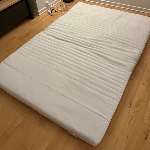 IKEA TUSSÖY overmadrass i hvit farge. Overmadrassen legges oppå en eksisterende madrass for å gi et jevnere og mer behagelig liggeunderlag. Trekket er av tekstil med glidelås, slik at det kan tas av ved behov. Passer til standard seng/madrass i tilsvarende størrelse som vist på bildene. Egnet til bruk på soverom som ekstra komfortlag på madrassen.